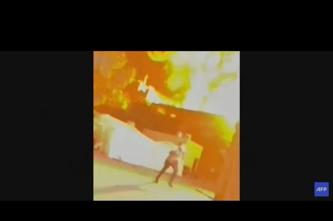 Sejumlah ledakan disusul api yang membumbung tinggi di langit yang gelap. Perekan video berada di balik tiang. Terdengar orang-orang berteriak di situasi mencekam ini.