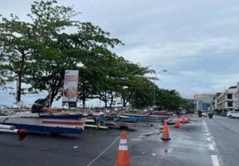 Razid Poli, salah satu nelayan di Kawasan Megamas, mengatakan, puluhan perahu ditambatkan di badan jalan agar tidak rusak disapu ombak besar.