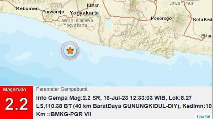 SOLO-WARTA BOGOR- Gempa bumi bermagnitudo 2,2 terjadi di barat daya Gunungkidul Daerah Istimewa Yogyakarta (DIY), pusat gempa berada di perairan Gunungkidul. Dikutif dari akun resmi Twitter BMKG DIY @bmkgjogja, Ahad (16-07-2023) gempa terjadi pukul 12.33 WIB.