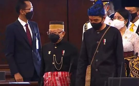 Jokowi berjalan memasuki gedung Parlemen dengan disambut Wakil Presiden Ma’ruf Amin dan Ketua MPR RI Bambang Soesatyo, Ketua DPR RI Puan Maharani, dan Ketua DPD RI La Nyalla Mattalitti.