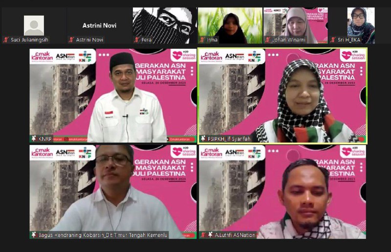 BOGOR-WARTA BOGOR-Komunitas Emak Kantoran bekerjasama dengan ASNation dan KNRP menggelar Sharing Session ke-20 dengan mengambil tema “Gerakan ASN dan Masyarakat Peduli Palestina. Acara yang diselenggarakan secara daring ini berlangsung pada hari Selasa, tanggal 26 Desember 2023, jam 09.00 – 11.50 WIB. Acara ini menghadirkan narasumber dari Kementerian Luar Negeri RI yaitu Bapak Bagus H Kobarsyih (Direktur Timur Tengah) dan perwakilan dari Komite Nasional untuk Rakyat Palestina (KNRP) Pusat yakni Bapak Suhartono Tjipto Basuki.