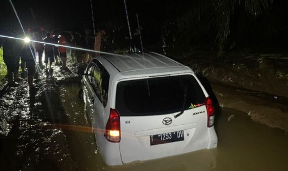 Dua jam kemudian sekitar pukul 20.00 WIB, Wadi menemukan mobil korban terperosok dalam lumpur di jalan milik perusahaan sawit PT Sukses Maju Abadi (SMA).