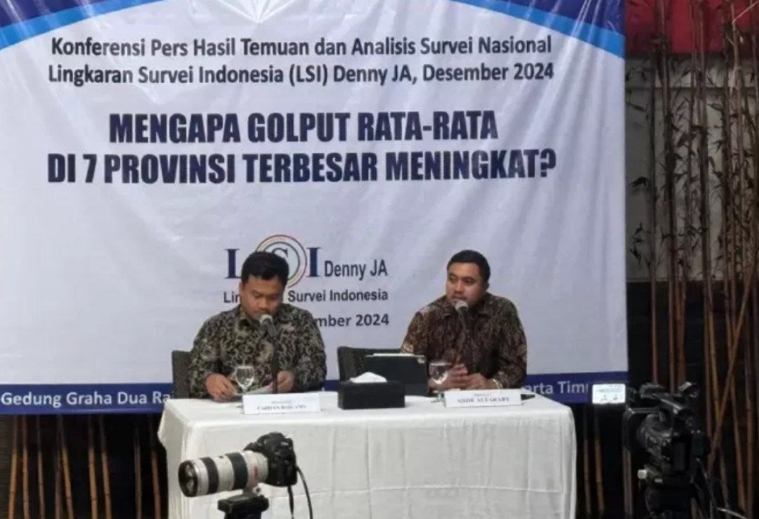 Peneliti senior Lembaga Survei Indonesia (LSI) Denny JA, Adjie Alfaraby memaparkan hasil temuan dan survei nasional terkait dengan angka golput dalam Pilkada 2024.