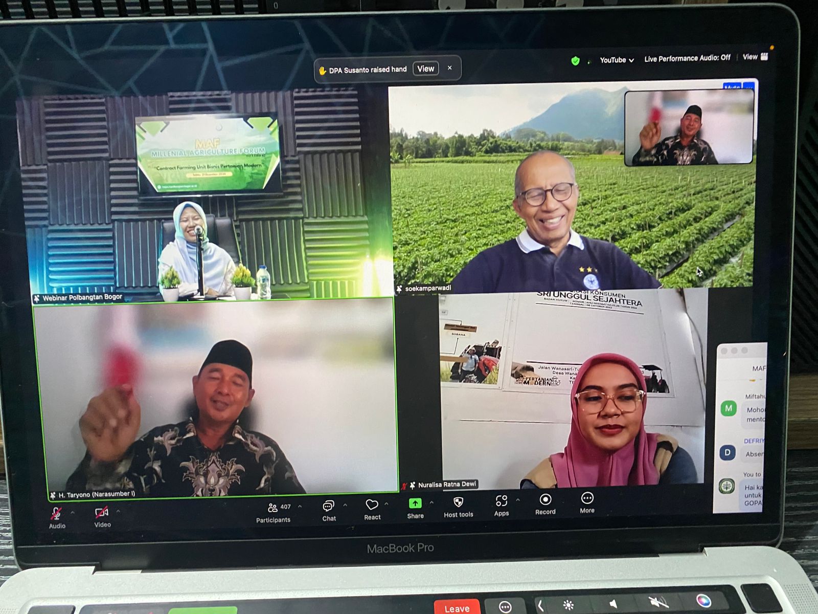 Milenial Agriculture Forum (MAF) Vol 5 Edisi 47 ini mendatangkan narasumber yang langsung berkiprah di dalam proses contract farming, diantaranya Ketua Koperasi Kencana Derma Ayu, Direktur Pengembangan Agribisnis Paskomnas Indonesia, serta Petani Milenial Alumni Polbangtan Bogor.