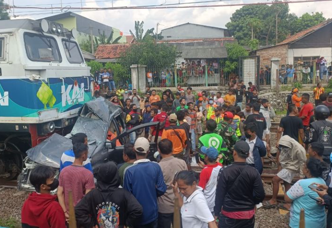 JAKARTA- WARTA BOGOR- Mobil Toyota Avanza berwarna hitam tertabrak kereta api jarak jauh relasi Semarang-Gambir PP di dekat Stasiun Tambun, Kabupaten Bekasi, Jawa Barat, Selasa (21/6/2022).