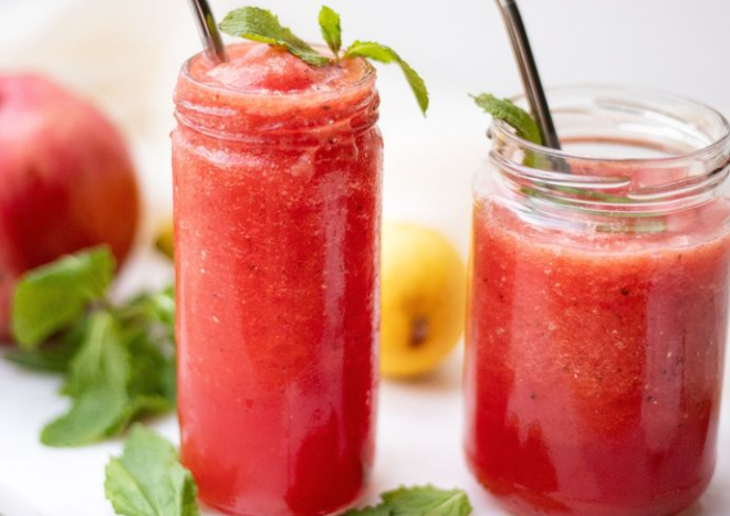 3. Masukan bahan es semangka ke dalam freezer hingga setengah beku, kemudian tuang es ke dalam gelas dan sajikan dengan siraman sirop delima atau cocopandan saat disajikan. (Kompas.com)