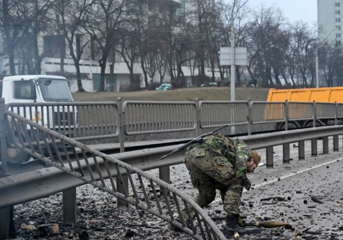 Sebelumnya, tembakan senjata ringan dan ledakan terdengar di distrik utara ibu kota Obolonsky ketika apa yang tampaknya merupakan pasukan invasi Rusia meninggalkan jejak kehancuram. (Kompas.com)