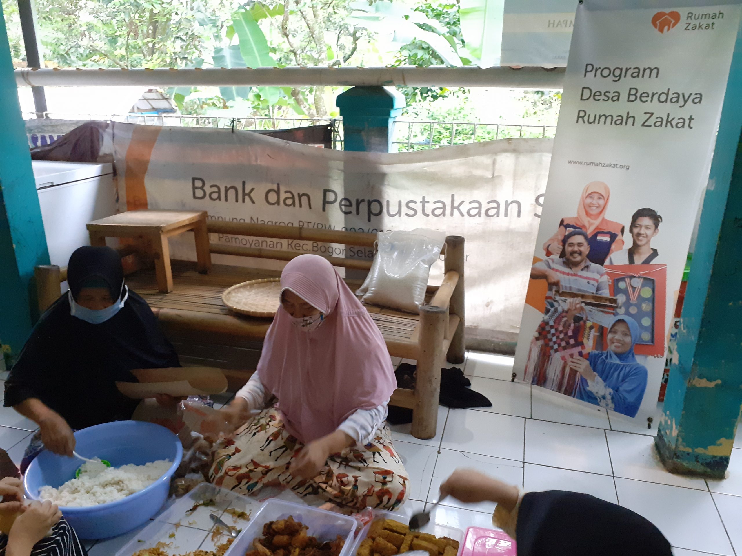 Kesibukan terlihat setiap sore di halaman rumah Relawan Inspirasi Rumah Zakat ini, mereka adalah ibu-ibu yang membantu menyiapkan makanan untuk dibagikan kepada masyarakat, khususnya yang terdampak wabah Covid-19 di Desa Berdaya Pamoyanan. Setelah selesai di kemas, maka makanan pun di distribusikan oleh Satgas Pencegahan Covid-19 kepada warga.
