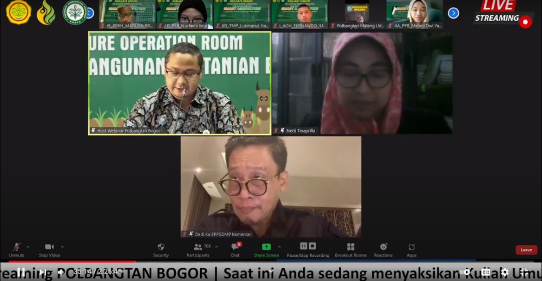 Webinar yang dihadiri oleh oleh 913 peserta gabungan dari aplikasi zoom dan live streaming youtube ini, dimoderatori secara langsung oleh Direktur Polbangtan Bogor, Detia Tri Yunandar.